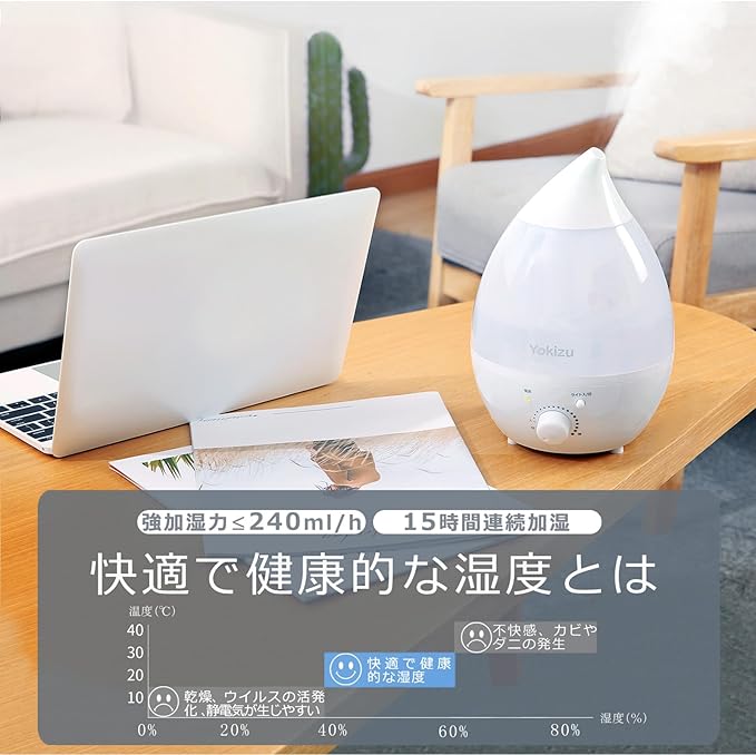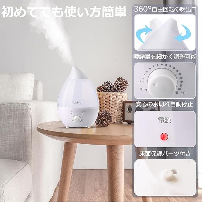 【無段階ミスト調節】ダイヤル操作で無段階に加湿量を調節可能。部屋の乾燥具合やお好きの湿度に合わせて簡单に微調節できます。自然蒸発しやすい5~10μm超微細ミストで、床や加湿器の周囲が濡れにくく、快適にお使い頂けます。操作がシンプルでわかりやすく、初心者やお年寄りにもオススメです。