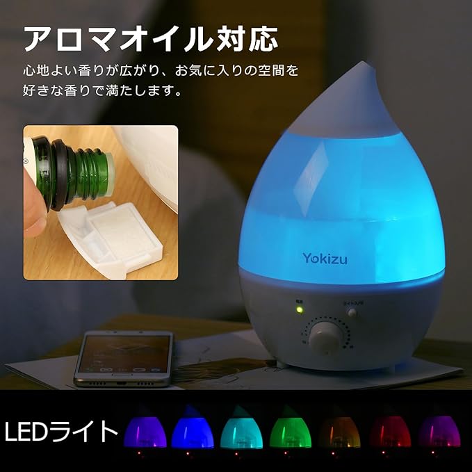 特徴 アロマディフューザー, タンク取り外し可能, ナイトライト, 超音波技術, 軽量