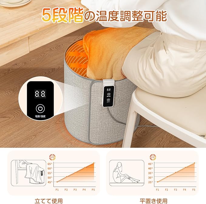 【モード別の細やかな温度・タイマー設定で快適さを追求】この足元ヒーター使い方に応じて、温度とタイマーを細かく調整できるのが特徴です。パワーが必要な「縦置きスタンドモード」では、45℃、50℃、55℃、60℃、65℃の5段階からお選びいただけます。タイマーも2、4、6、8時間の4段階で設定可能なので、就寝時や外出時の消し忘れを防ぎ、安心してお使いいただけます。肌に直接触れる「横置きマットモード」では、低温やけどのリスクを軽減した25℃、30℃、35℃、40℃、45℃の5段階の優しい温もりを設定。タイマーは1時間と2時間の2段階で、うたた寝や休息時にぴったりです。