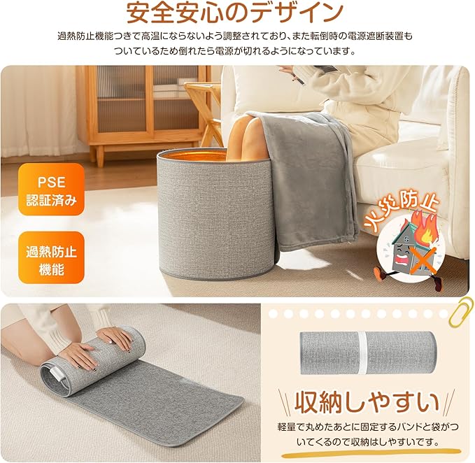 【厳選された安全機能で、ご家族皆様に安心してお使いいただけます】万が一の過熱を感知すると自動で電源をオフにする 「過熱保護機能」 を内蔵。また、高品質な立体防水素材を使用しているため、ちょっとした水滴や湿気も気になりません。最も重要なのは、日本の厳格な電気用品安全法に基づく 「PSE認証」 を取得済みである点です。第三者機関による安全基準クリアの証であるため、お子様やペットのいるご家庭でも、どうぞご安心ください。
