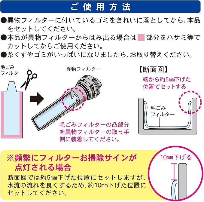 【ご使用方法】1. 毛ゴミフィルターの凸部分を異物フィルターの取っ手側に装着して下さい。2. 端から約5mm下げた位置でセットします。頻繁にお掃除サインが点灯される場合は、水流の流れを良くするため、約10mm下げた位置にセットして下さい。