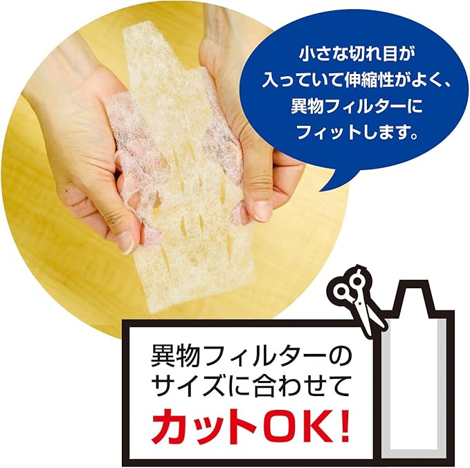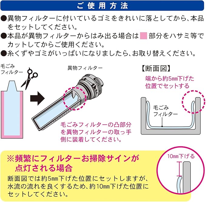 【使用上の注意】・異物フィルターに付いているゴミをきれいに落としてから、本品をセットして下さい。 ・本品が異物フィルターからはみ出る場合は、ハサミ等でカットしてからご使用下さい。 ・糸くずやゴミがいっぱいになりましたら、お取替え下さい。・頻繁にお掃除サインが点灯される場合は、水流の流れを良くするため、約10mm下げた位置にセットして下さい。
