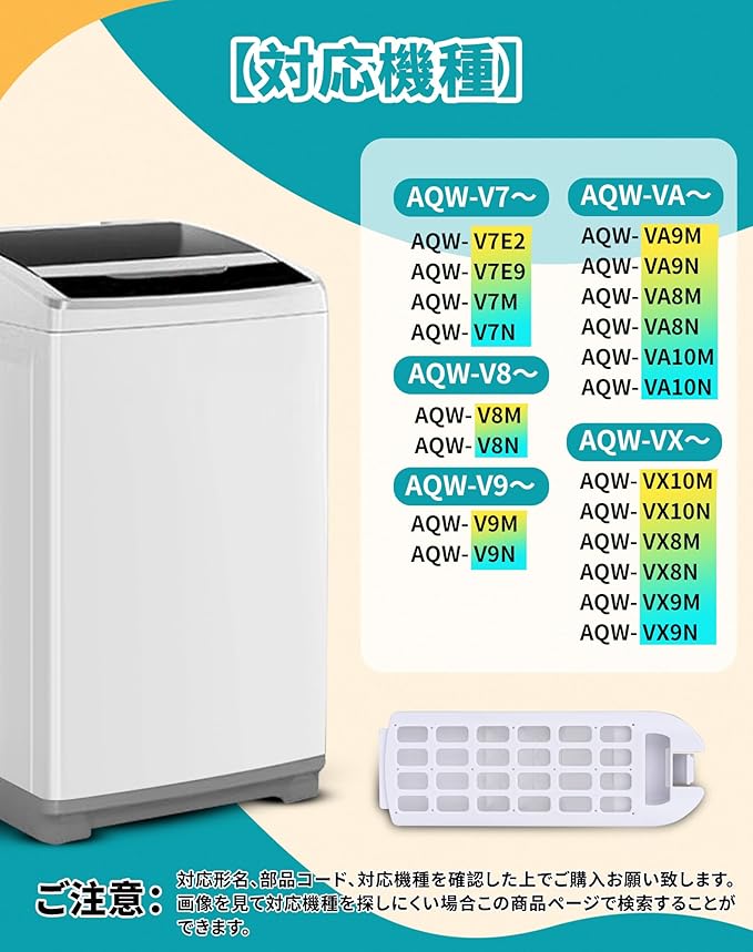 【対応機種】アクア洗濯機糸くずフィルターlint 52で、主な以下の機種:AQW-GV90HBK、AQW-GV90J、AQW-GVX100J、AQW-GVX90J、AQW-KSGP7H、AQW-P7MJ、AQW-S7E2、AQW-S7E9、 AQW-V7E2、AQW-V7E9、AQW-VA10M、AQW-VA10N、AQW-VA8M 、AQW-VA9M、AQW-VA9N、AQW-VX10M、AQW-VX10N、AQW-VX8M、AQW-VX8N、AQW-VX9M、AQW-VX9N。ご購入の際、本体型番、サイズをご確認ください。
