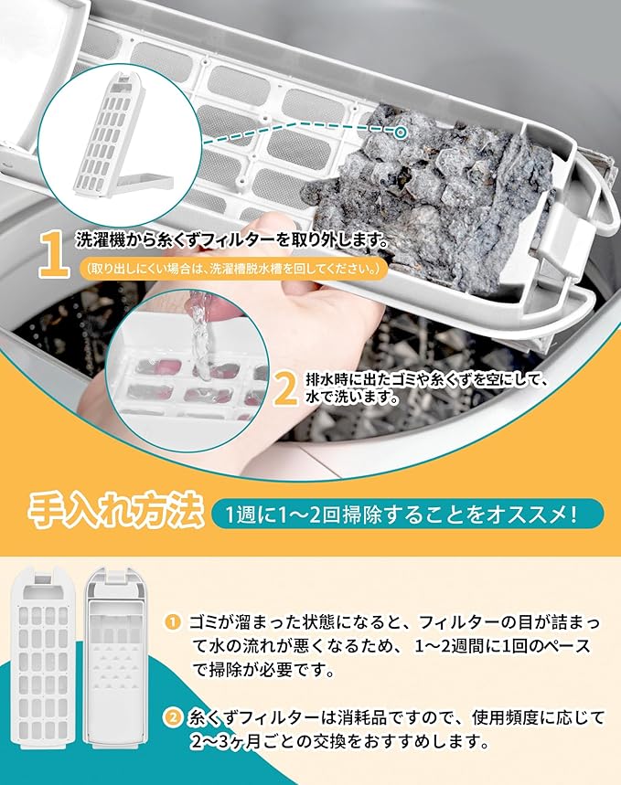 【メンテナンス】アクア 洗濯機 糸くずフィルターは消耗品なので、使用頻度に応じて、 2〜3ヶ月ごとにフィルターを交換することをお勧めします。汚れた糸くずフィルターはカビが生えたり、擦り切れて破れる前に早めに取り替えることをおすすめいたします。洗濯物をきれいに保つために、洗濯機の使用頻度によって、洗濯機用糸くずフィルターは、少なくとも1週間を目安に定期的に洗濯してください。