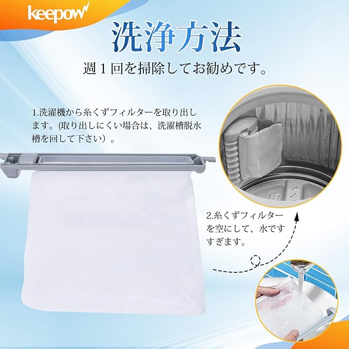 【使用上の注意点】洗濯物をきれいに保つために、洗濯機の使用頻度によって、洗濯機の糸くずフィルターは、少なくとも1週間を目安に定期的に洗濯してください。洗い方: (1) 洗濯機から糸くずフィルターを取り出します。(取り出しにくい場合は、洗濯槽脱水槽を回して下さい)。 (2) 糸くずフィルターを空にして、水ですすぎます。 (3) 糸くずフィルターを洗濯機にセットします。