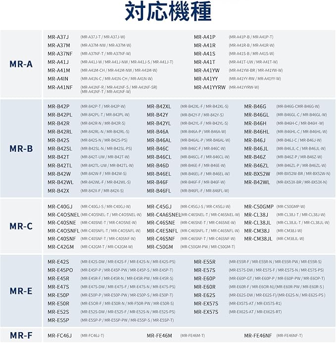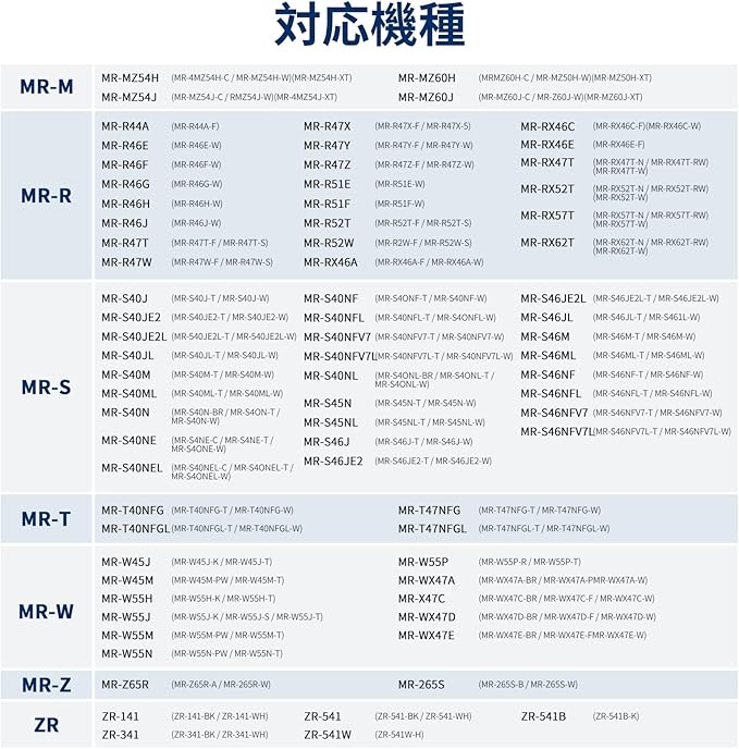 【対応機種】MRPR-01FT、MR-JX52W、M20VJ5526、MR-JX53Z、MR-JX61Y、MR-JX60W、MR-MB45E、MR-RX47T、MR-RX52T、MR-WX60A、MR-MX50F、MR-MX57D、MR-B46A、MR-WX47C、MR-WX71Z、MR-B46D、MR-R47W、MR-WX47D、MR-A41J、MR-A41JS、MR-A41M、MR-A41N、MR-A41NF、MR-A41NFS、MR-A41R、MR-A41SB、MR-A41T、MR-A41YW、MR-A41YY、MR-B42T、MR-A37JT、MR-A37M、MR-A37NFなどのMR-AシリーズからMR-Zシリーズまでの三菱冷蔵庫に対応しています。詳細な対応機種については、商品紹介画像をご覧ください。