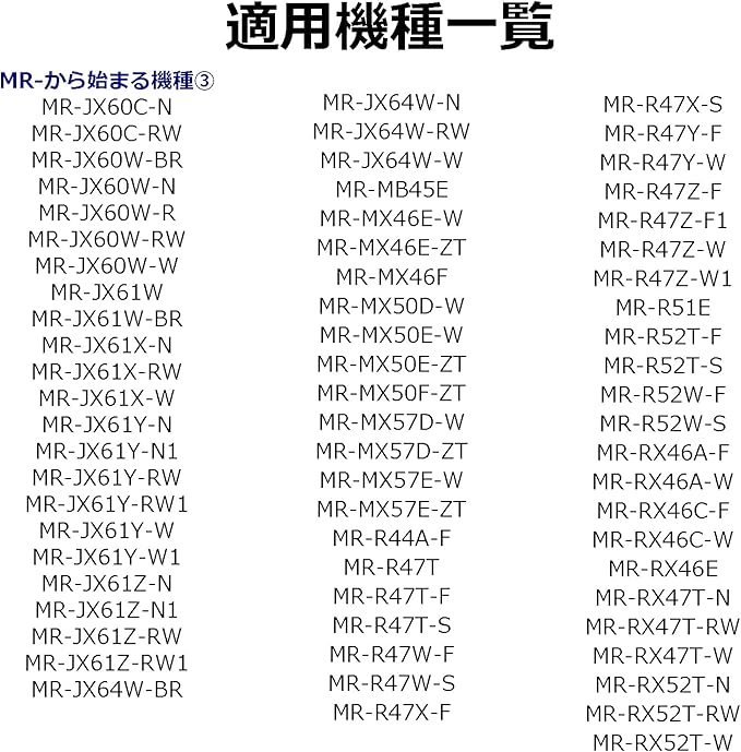 MR-JX61Z-RW1、MR-JX64W-BR、MR-JX64W-N、MR-JX64W-RW、MR-JX64W-W、MR-R44A-F、MR-R47T、MR-R47T-F、MR-R47T-S、MR-R47W-F、MR-R47W-S、MR-R47X-F、MR-R47X-S、MR-R47Y-F、MR-R47Y-W、MR-R47Z-F、MR-R47Z-F1、MR-R47Z-W、MR-R47Z-W1、MR-R52T-F、MR-R52T-S、MR-R52W-F、MR-R52W-S、MR-RX46A-F、MR-RX46A-W、MR-RX47T-N、MR-RX47T-RW、MR-RX47T-W、MR-RX52T-N、MR-RX52T-RW