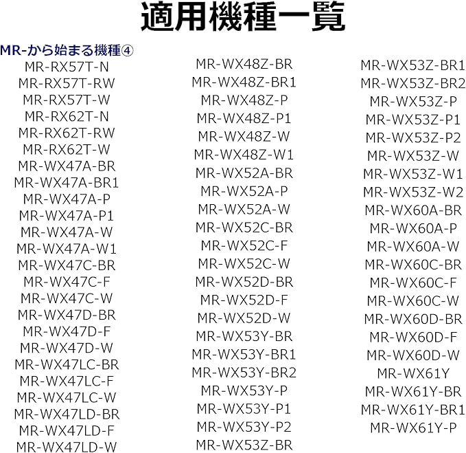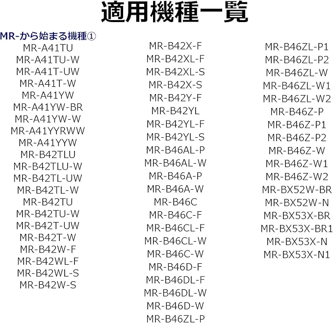 【適用機種一覧】 MR-A41TU、MR-A41TU-W、MR-A41T-UW、MR-A41T-W、MR-A41YW、MR-A41YW-BR、MR-A41YW-W、MR-A41YYRWW、MR-A41YYW、MR-B42T-W、MR-B42T-UW、MR-B42TL-W、MR-B42TL-UW、MR-B42TLU、MR-B42TLU-W、MR-B42TL-W、MR-B42TU、MR-B42TU-W、MR-B42W-F、MR-B42W-S、MR-B42WL-F、MR-B42WL-S、MR-B42X-F、MR-B42X-S、MR-B42XL-F、MR-B42XL-S、MR-B42Y-F、MR-B42YL、MR-B42YL-F、MR-B42YL-S