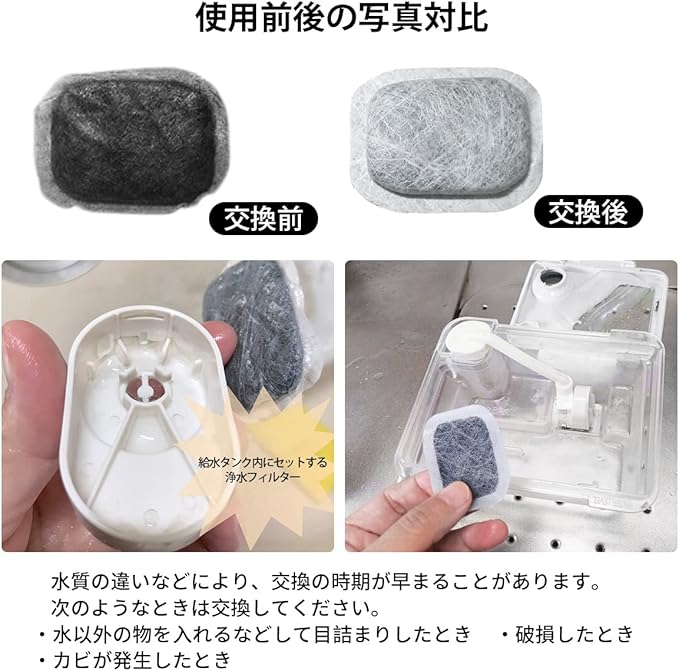 水質の違いなどにより、交換の時期が早まることがあります。次のようなときは交換してください。 ・水以外の物を入れるなどして目詰まりしたとき ・破損したとき ・カビが発生したとき