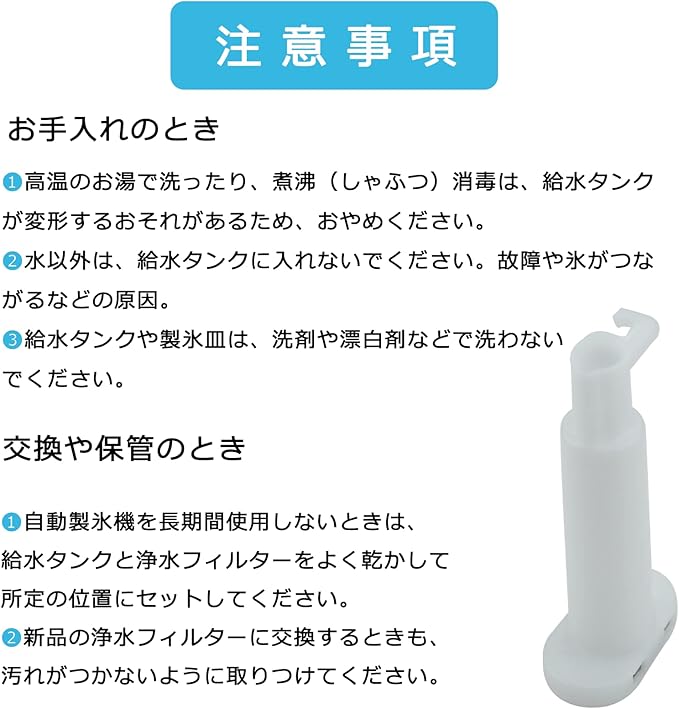 【お手入れ目安】1週間に1回。浄水フィルターに水あかなどが詰まっていると製氷できないことがあります。