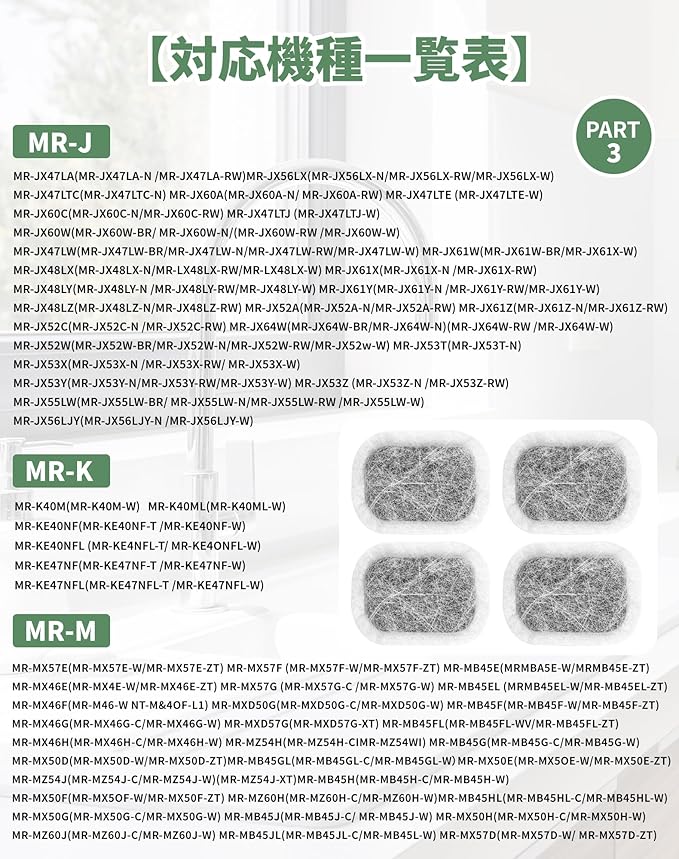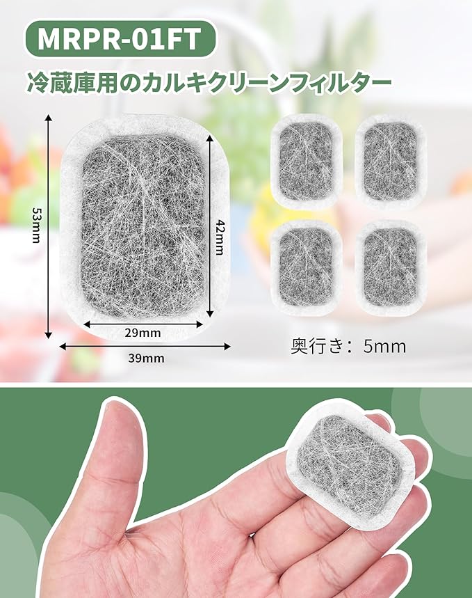 【対応品番】MRPR-01FT三菱冷蔵庫用製氷機 フィルター。(給水タンク内にセットする浄水フィルター、M20CM5526/M20VJ5526 の同等品、M20KW0526/M20KWO526 と同じサイズです。)、材質:ポリエステル・活性炭、 機能:水道水の塩化物、硫酸塩、鉛、亜鉛、ヒ素などの不純物を効果的に除去し、カルキ臭を取り除き、氷を純粋で美味しくすることができます。