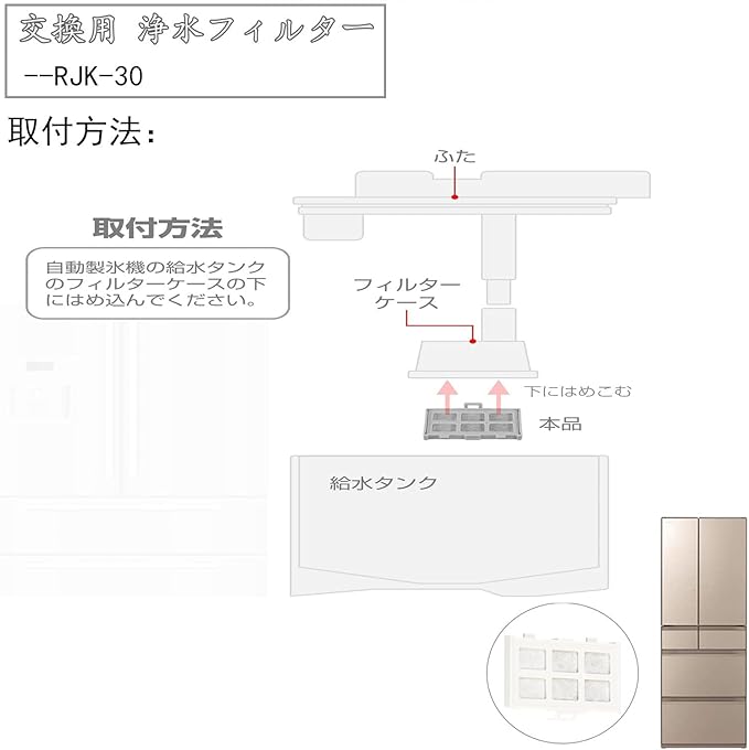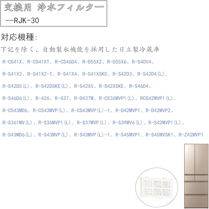 【適応機種】適応機種もたくさんある自動製氷用浄水フィルター 。適応機種は自動製氷機能を採用した機種のうち、次の型番以外の機種となります。:R-CS41X、R-CS41XT、R-CS46D4、R-D55X2、R-D55X6、R-S40V4、R-S41X2、R-S41X2-T、R-S41X4、R-S41XSKC、R-S42D3、R-S42D4(L)、R-S42D5(L)、R-S42DSKE(L)、R-S42X5、R-S42XSKE、R-S46D4、R-S46D6(L)、R-426、R-437、R-D437M、R-CS36MVP1(L)、R-CS42MVP1(L)、R-CS43MD6、R-CS43MVP(L)、R-CS43MVP(L)-1、R-D42MVP1、R-D42MVP2、R-S361MV(L)、R-S36MVP1(L)、R-S37MVP(L)、R-S39MV6(L)、R-S42MVP1(L)、R-S43MD6(L)、R-S43MVP(L)、R-S43MVP(L)-1、R-S45MVP1、R-S45MVSK1、R-Z42MVP1 。