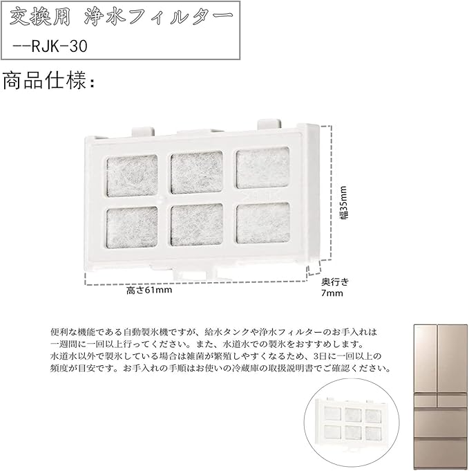 【商品情報】 自動で製氷する冷蔵庫用氷用浄水フィルター RJK-30 (4個入)「互換品」。商品の寸法は奥行き7mm、幅35mm、高さ61mmです。