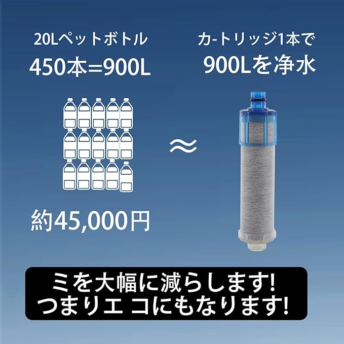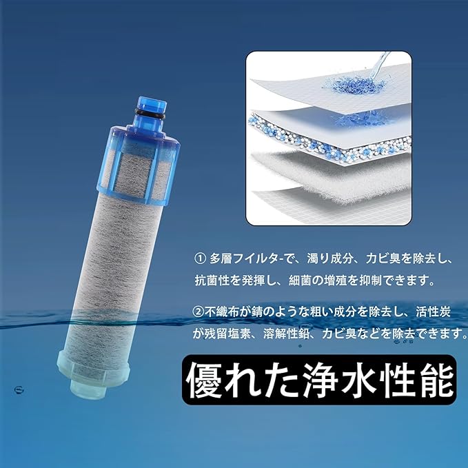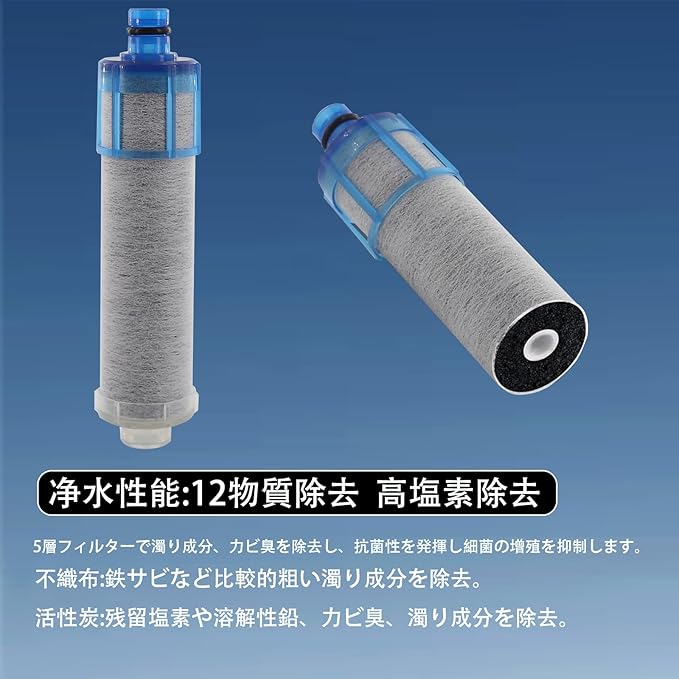 【高機能濾過材料の組み合わせ】 活性炭、不織布、中空繊維膜(原材料:アルミン酸カルシウム)を採用。活性炭が異味・異臭や有害物質を吸着除去し、不織布で微粒子をろ過、中空繊維膜が高精度濾過を発揮。 これらの相乗効果で、12 種類の物質を最大 95% 除去。1 本で最大 1200L の水を濾過可能です。 環境に配慮した材料を使用し、廃棄時の負担も抑えられる安心設計です。