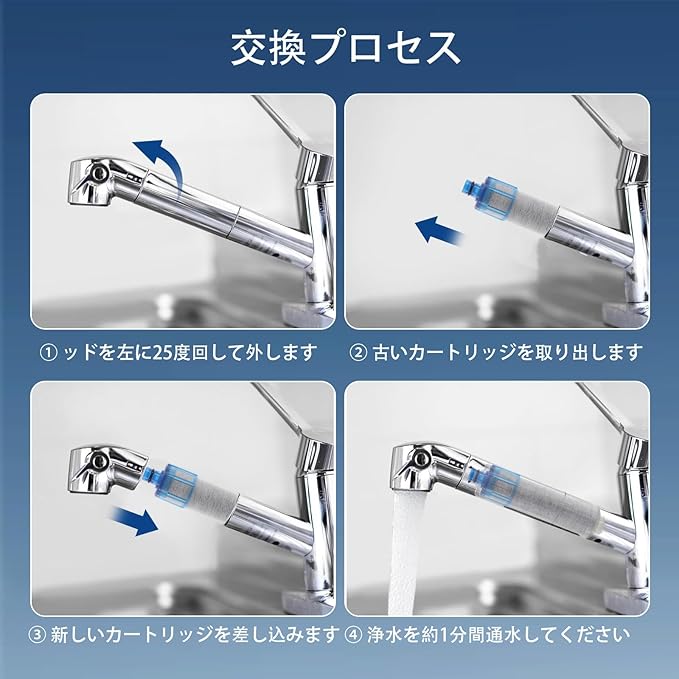 【フィルターカートリッジ交換ガイド】 1 日 10 リットル使用の基準で、約 4 ヶ月に 1 回の交換を推奨。ただし、使用水量や水圧、水質などの環境により交換時期は異なる場合があります。 ご使用環境に合わせて適切なタイミングで交換することで、常に高品質な浄水をご利用いただけます。快適で安心な浄水生活の参考にしてください。