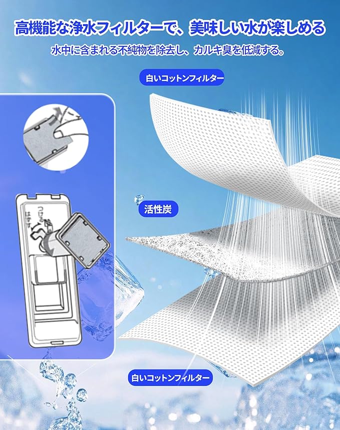 【自動製氷の冷蔵庫に必要品】シャープ用の冷蔵庫 製氷機に使用できる浄水フィルターは製氷機フィルターは、定期的なメンテナンスが必要な重要部品です。製氷機の氷 フィルターの劣化を放置すると、カビたりヌメリが、カビやぬめりの原因となり、氷の味や清潔さに悪影響を与えることもあります。活性炭入りの製氷機フィルターを使えば、水道水中のカルキをしっかり除去し、雑味のない美味しい氷がいつでも作れます。