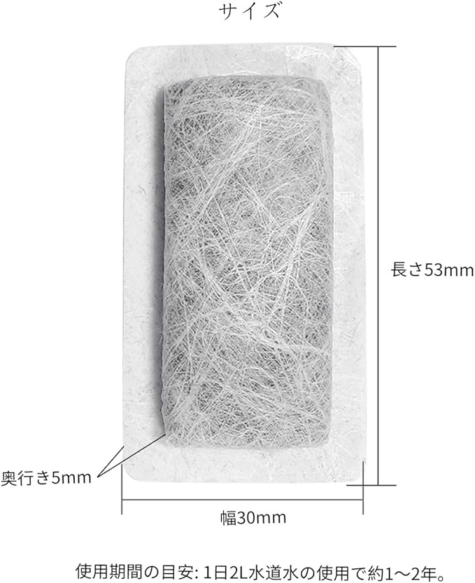 "【材質】本製品には二つの材質(ポリエステル・活性炭)が含まれています。ポリエステル:取り扱いがしやすい素材なので、お手入れが簡単です。速乾性や防しわ性に優れて、丈夫で縮みや型崩れが起きにくく熱に強い 。活性炭:水中の有機物を除去、特にフミン質などの色度を有する有機物に対して非常に高い性能を持ちます。脱臭や前段のろ過工程で生じたトリハロメタン類、フロロ酢酸類といった副生成物の除去に使用されます。また、その硬さから残留塩素を除去することにも適しています。 "
