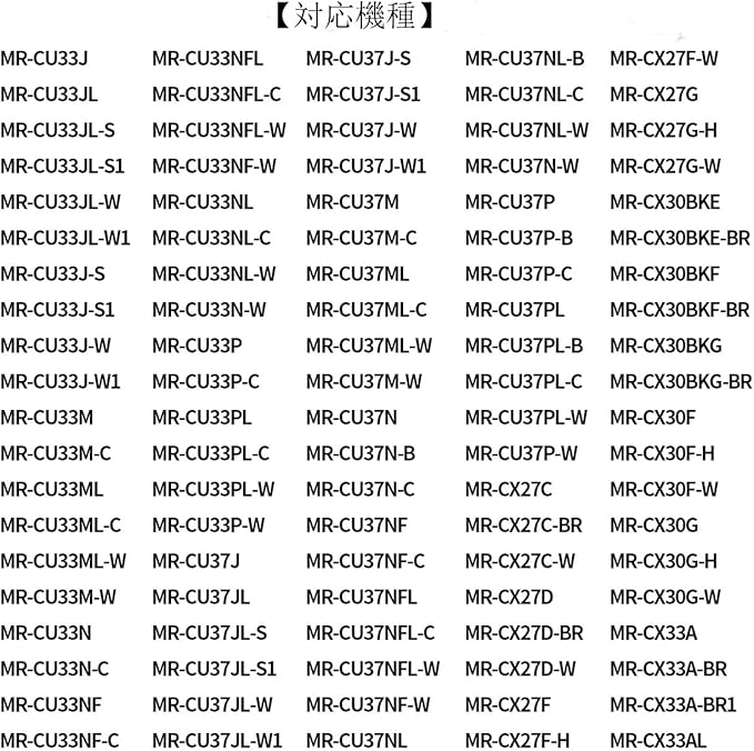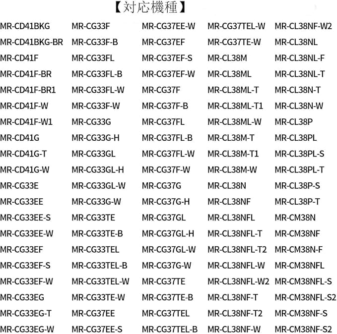 【対応機種】 MRPR-01FT MR-JX52W M20VJ5526 MR-JX53Z MR-JX61Y MR-JX60W MR-MB45E MR-WX47C MR-WX71Z MR-B46D MR-RX47T MR-RX52T MR-WX60A MR-MX50F MR-MX57D MR-B46A MR-R47W MR-WX47D MR-A41J MR-A41JS MR-A41M MR-A41N MR-A41NF MR-A41NFS MR-A41R MR-A41SB MR-A41T MR-A41YW MR-A41YY MR-B42T MR-A37JT MR-A37M MR-A37NFなどのMR-A シリーズからMR-Zシリーズまでの三菱冷蔵庫に対応しています。より詳細な対応機種については、商品紹介画像をご覧ください。
