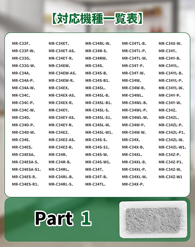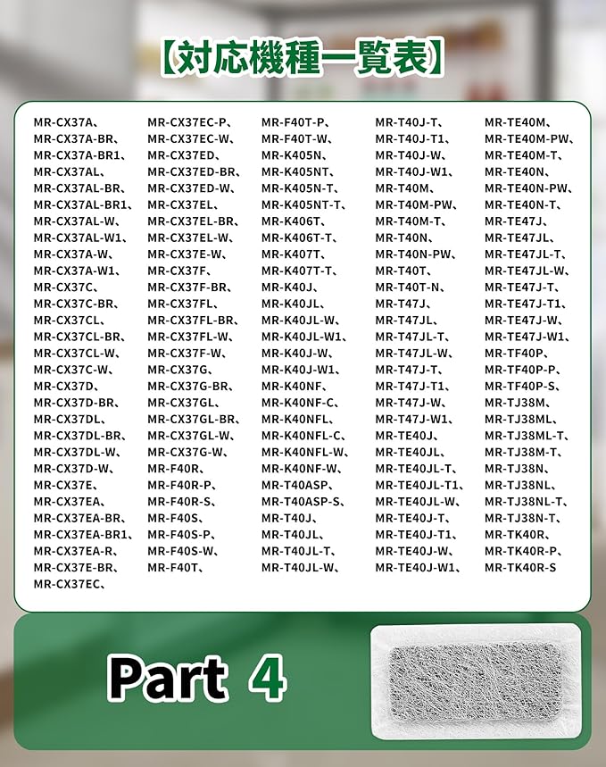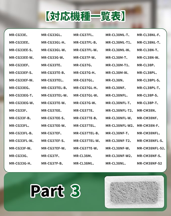 【対応機種】MR-C33F、MR-C33F-W、MR-C33G、MR-C33G-W、MR-C34A、MR-C34A-P、MR-C34A-W、MR-C34C、MR-CL38N-T、MR-CL38N-W、MR-CL38P、MR-CL38PL、MR-CL38PL-S、MR-CL38PL-T、MR-CL38P-S、MR-CL38P-T、MR-CM38N、MR-CM38NF、MR-CM38N-F、MR-TJ38NL、MR-TJ38NL-T、MR-TJ38N-T、MR-TK40R、MR-TK40R-P、MR-TK40R-Sに対応できる三菱用冷蔵庫製氷機フィルターです。(ほとんどの三菱冷蔵庫製氷機に対応できすが、具体的な機種は写真と商品の説明を参考至てください。)