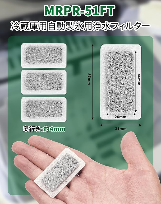 【対応品番】MRPR-01FT三菱冷蔵庫用製氷機 フィルター。(給水タンク内にセットする浄水フィルター、M20CM5526/M20VJ5526 の同等品、M20KW0526/M20KWO526 と同じサイズです。)、材質:ポリエステル・活性炭、 機能:水道水の塩化物、硫酸塩、鉛、亜鉛、ヒ素などの不純物を効果的に除去し、カルキ臭を取り除き、氷を純粋で美味しくすることができます。