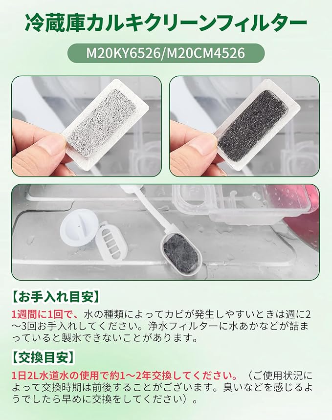 【交換目安】1日2Lの水道水を使用した場合、約1-2年間使用できます。水質の違いなどにより、交換時期が早まることがあります。(使用状況によって交換時期は前後する場合があります。水以外の物を入れるなどして目詰まりしたとき ・破損したとき ・カビが発生したとき・氷にニオイがついたり、氷が小さかったりとデキが悪くなったと思ったら、早めに交換してください)。交換手順につきましては、お手入れの手順はお使いの冷蔵庫の取扱説明書でご確認ください。