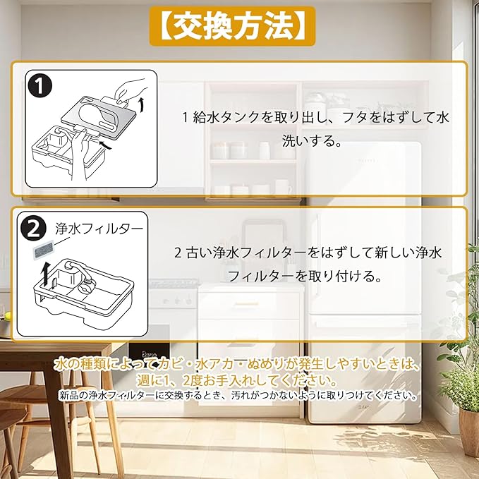 【お手入れ目安】1週間に1、2回。浄水フィルターに水あかなどが詰まっていると製氷できないことがある。 給水タンクや製氷皿は、洗剤や漂白剤などで洗わないでください