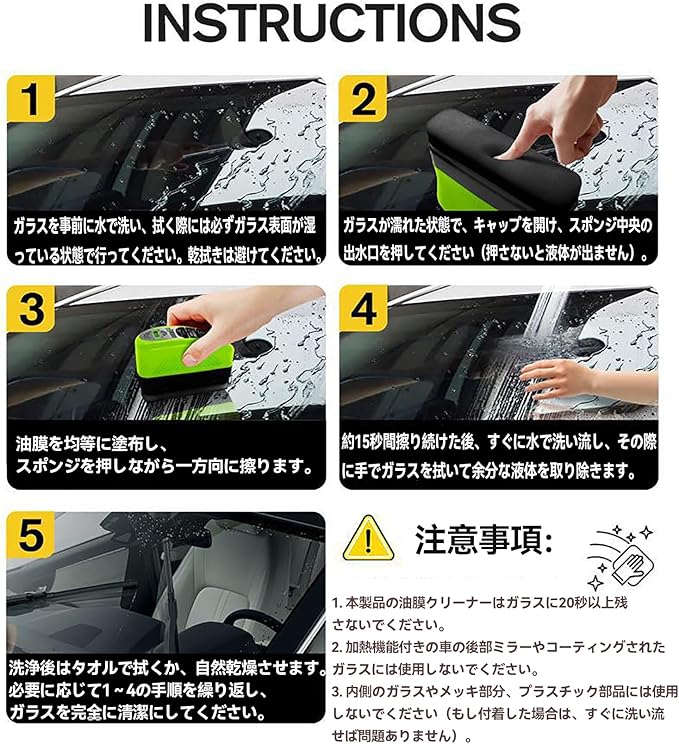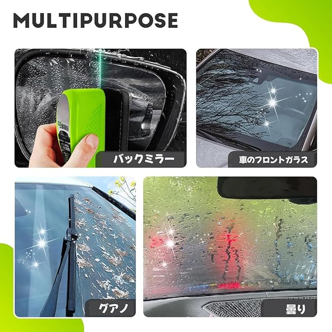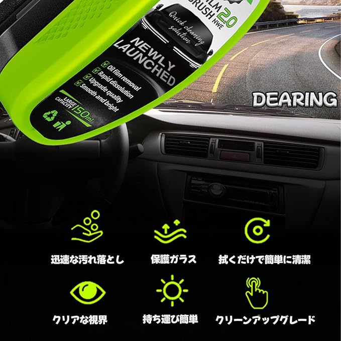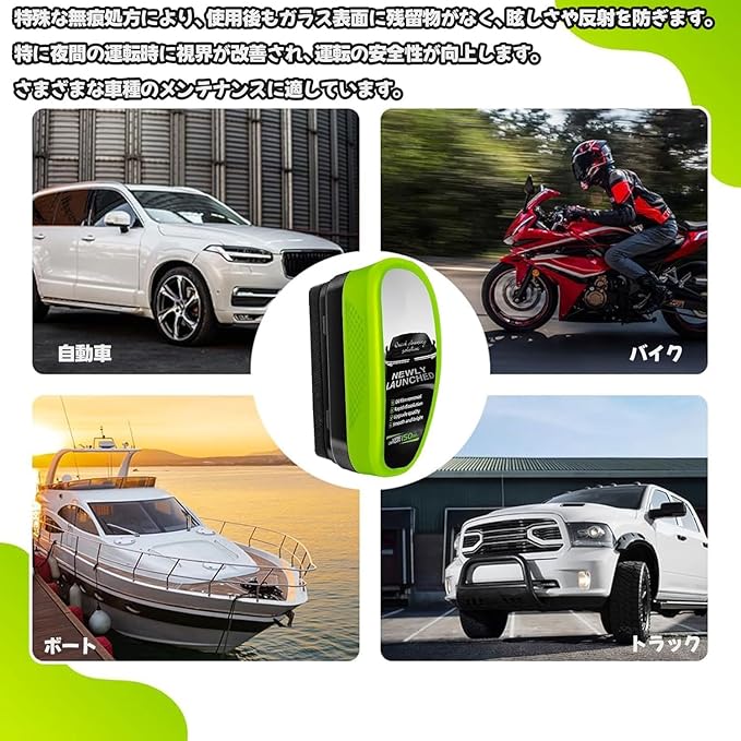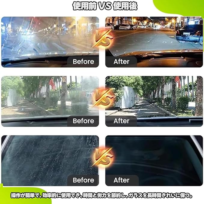 **【無痕配方で視界をクリアに】** 特別な無痕処方により、使用後に残留物が残らず、反射や眩しさを防ぎます。特に夜間運転時の視界を改善し、安全性を向上させます。