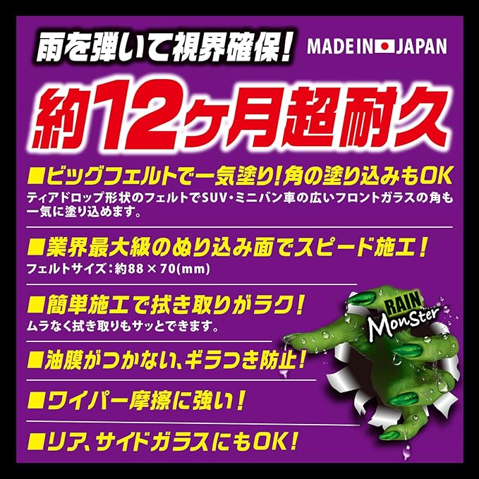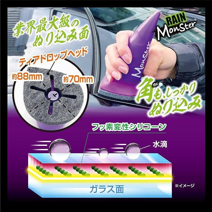 雨はもちろん豪雨や台風時の大雨、さらに対向車の水はねなどの際も安全な視界を確保します。フェルトにもこだわり、ビッグなティアドロップ(雫)形状でガラスの広い面を一気に塗り込めます。また三角の部分で隅々まで塗り込め、ガラス全体を満遍なくスピーディーに施工ができます。