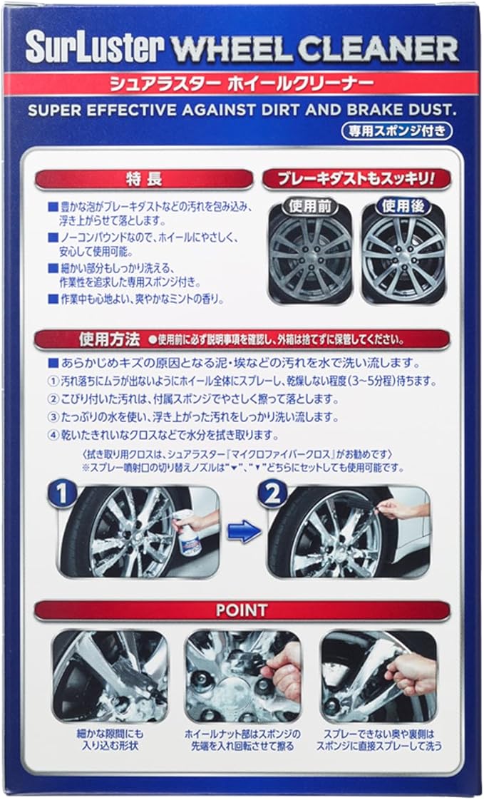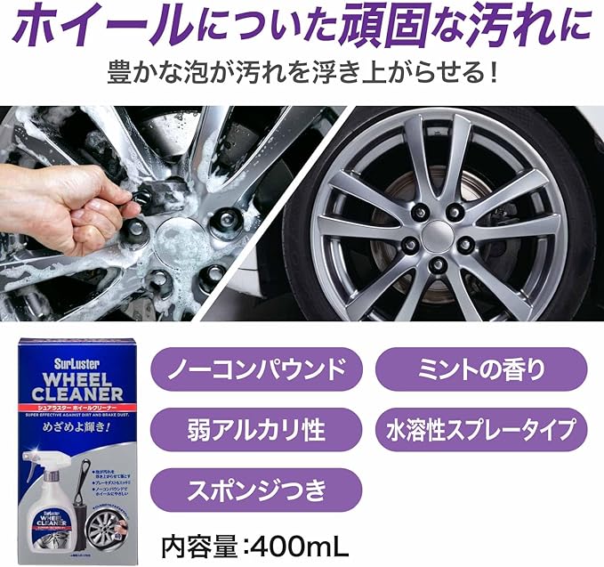 SurLuster(シュアラスター) ホイールクリーナー 400ml スプレー 弱アルカリ性 ノーコンパウンド ブレーキダスト 油汚れ 専用スポンジ付き 洗車 泡 車 バイク S-65