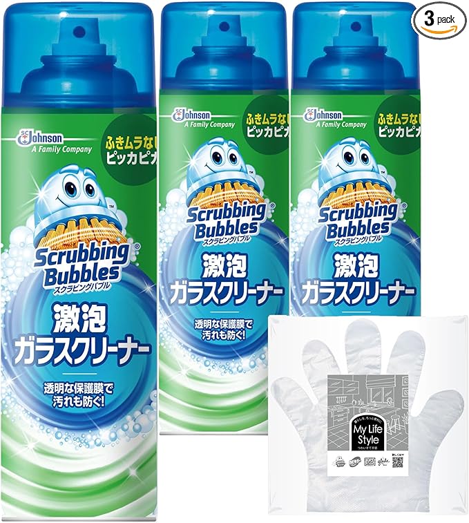 スクラビングバブル (Scrubbing Bubbles) 激泡ガラスクリーナー エアゾールタイプ 480ml 3本 お掃除手袋つき ガラス用洗剤 ガラスクリーナー 鏡 窓 洗剤 掃除 掃除グッズ 汚れ落とし まとめ買い 【Amazon.co.jp 限定】