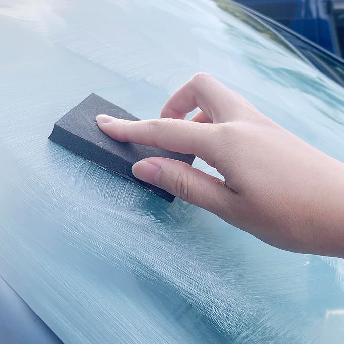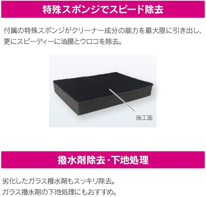 独自配合の研磨剤と結晶質シリカにより、油膜とウロコ(ウォータースポット)を同時+スピーディーに徹底除去することが可能です。ギラギラ油膜とウロコを除去して安全な視界を確保します。