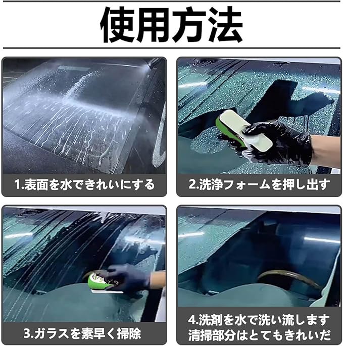 塗布が簡単:自動車用油膜取りブラシと内蔵アプリケーターを使用すれば、フロントガラス全体にわずか数分で簡単に塗布できます。注意: 油膜洗浄効果を最大限に高めるには、洗浄液をスポンジに完全に絞り出してください