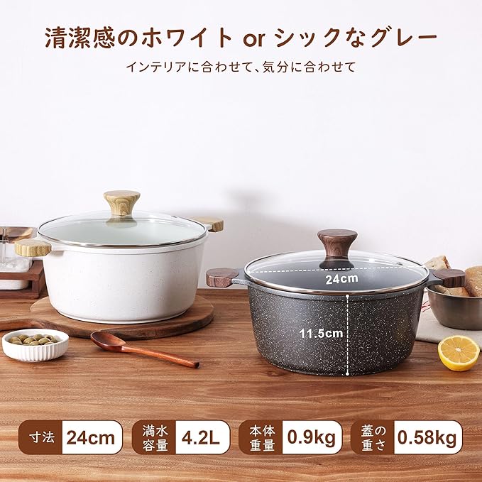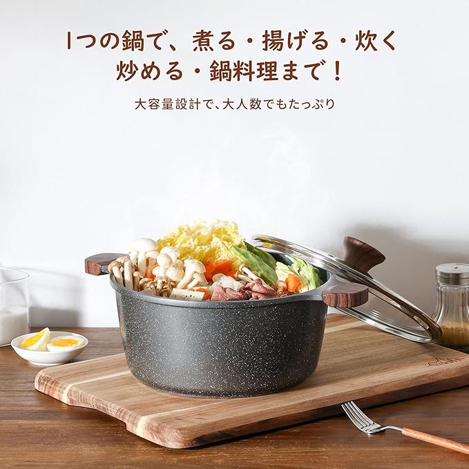 【深型設計で軽量化を実現】鍋は深く、縁も広く設計されており、満水時の容量は4.2L(鶏1羽と具材が丸ごと入る大きさ)です。家族全員分の味噌汁やカレー、天ぷら、パスタ、鍋料理まで作れます。本体重量はわずか0.45kgと軽量で、移動やお手入れも楽々。そのまま食卓に置いても使えます。