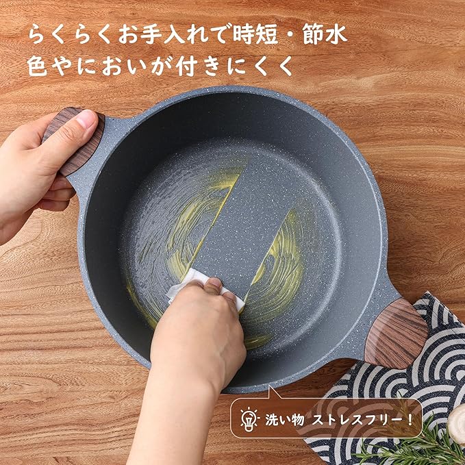 【お手入れ簡単】本体とハンドルの接合部がリベットがないため、お手入れは簡単です。スポンジを使って数秒間でお手入れできます。コーティングの寿命を延ばすために、できるだけ手洗いのほうをお勧めします。