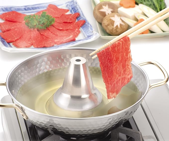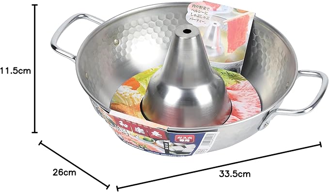 〇肉や野菜でヘルシーにしゃぶしゃぶパーティー 製品サイズ(約) : 幅335x奥行260x高さ150mm(板厚 : 0.7mm) 製品重量(約) : 520g 本体 : ステンレス鋼(クロム16%) 取っ手 : 鉄(クロムめっき) 生産国 : 日本