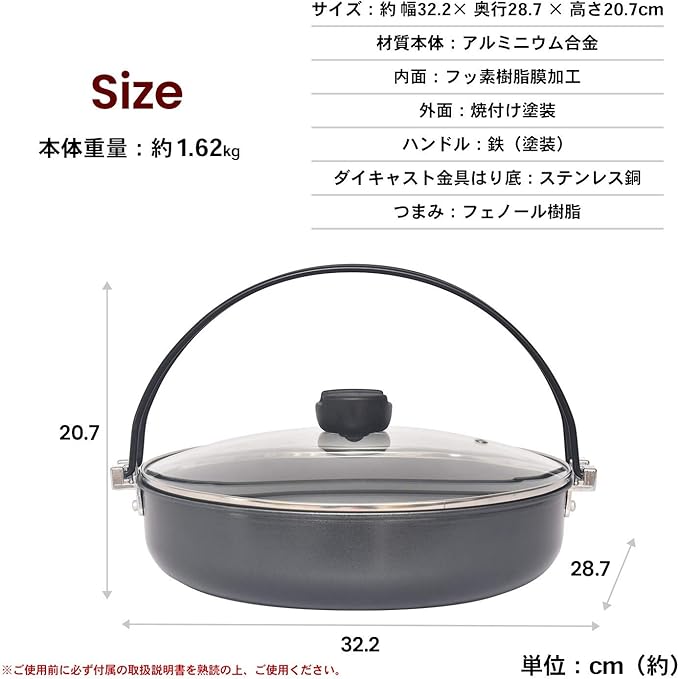 【特長】●IH調理器にも使用OK。●こびりつきにくくお手入れしやすい。●内面フッ素樹脂加工●ガラスふた付き●ガラスふたの取っ手にお箸が置けるようになっていて便利。