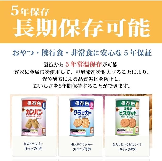 長期保存が可能な缶入り非常食。 製造より5年保存可能! ※流通の段階で多少のお時間がかかるため、お手元に届く際には賞味期限が5年を切る場合もございます(賞味期限4年以上を保証)