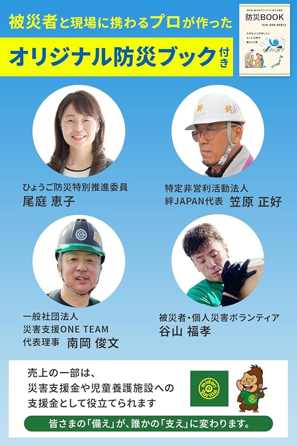 【オリジナル防災ブック付き】災害時のリアル体験談から生まれた、ネット情報では得られない実践的アドバイス集。支援者・防災士・被災者の声をまとめた現場目線の1冊です。開発者がボランティア活動で知り合った方々です。