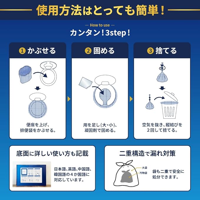 ✅【使いやすく緊急時でもすぐに利用可能】使用方法がシンプルで、説明イラストも付属しているため、緊急時でもすぐに利用できます。トイレの便座にピッタリはめられる仕様で、初めての使用者でも簡単に取り付けが可能です。準備が簡単で時間がかからないため、緊急対応でも安心してご利用いただけます。