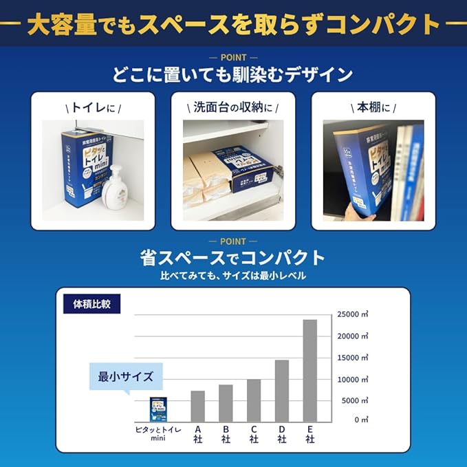 ✅【省スペース設計でコンパクトサイズ】100回分の使用が可能な非常用トイレが4サイズのコンパクトな形で収納されています。スペースを取らず、オフィスや家庭の引き出しや棚にも収めやすいため、災害時にも安心して備蓄できます。大人数が集まる場所でも、狭い収納スペースで十分に備蓄が可能です。