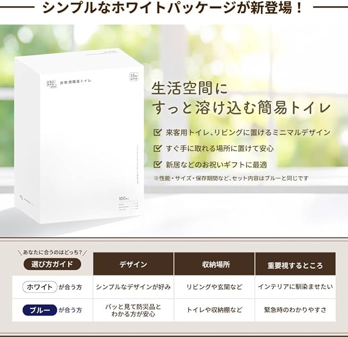 100回分の使用が可能な非常用トイレが4サイズのコンパクトな形で収納されています。スペースを取らず、オフィスや家庭の引き出しや棚にも収めやすいため、災害時にも安心して備蓄できます。