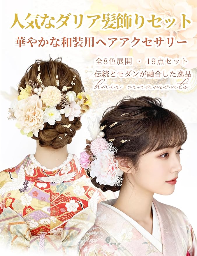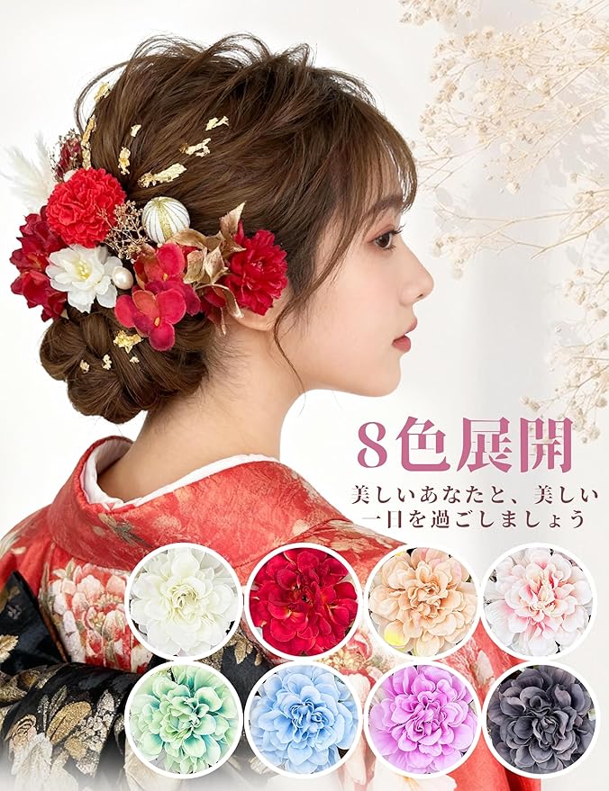 【多様なシーンで活躍】 成人式という特別な日に、晴れやかな装いをより美しく引き立ててくれるヘアアクセサリー。 やさしい色合いと繊細なデザインが、振袖姿に上品な華やかさを添えます。 成人式はもちろん、卒業式や結婚式など、大切な日にもそっと寄り添い、あなたらしい輝きを演出します。