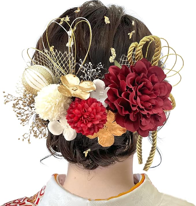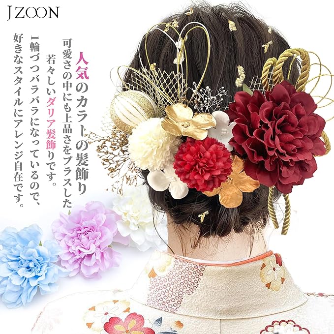 [JZOON] 8色展開 ドライフラワー 髪飾り ダリア 造花飾り 和玉 赤 ヘアアクセサリー 成人式 ゴールド 水引 ヘッドパーツ あじさい 振袖 着物 卒業式 七五三 浴衣 袴 結婚式 かすみ草 和装 造花 手作り 専用ケース付き DL020
