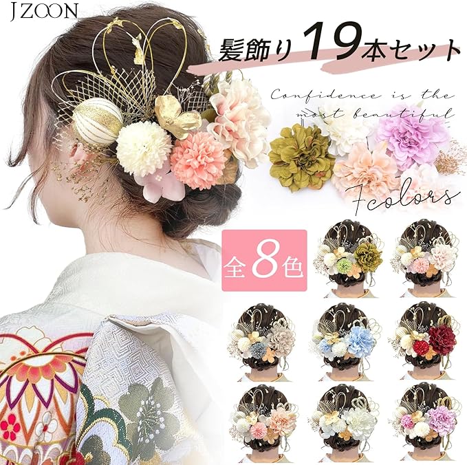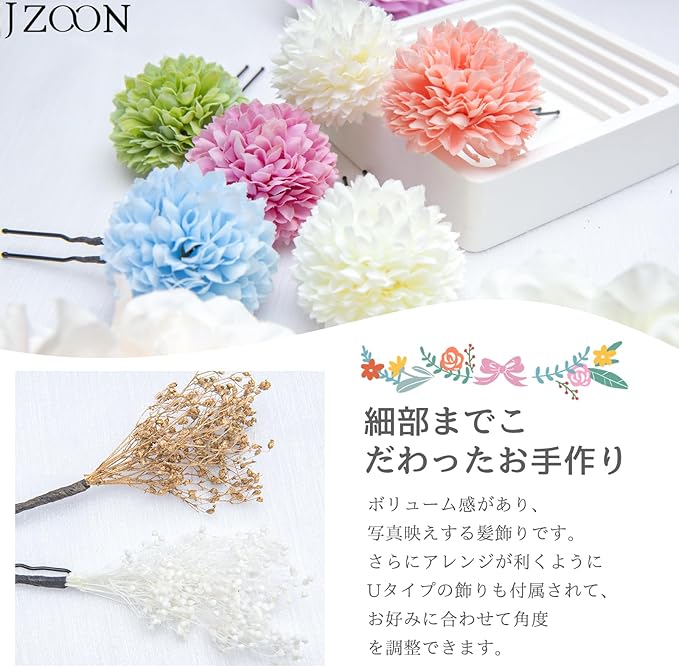 【嬉しい多色展開】厳選された素材がたっぷり、お手作りしたJZOONの髪飾りです。人気な色がたくさん揃っており、レッド、パープル、ピンク、グレー、シャンパン、オリーブグリーン、ホワイト、ブルー全8色を、ハレの日のお服や気分に合わせて、ご自由にお選びいただけます。
