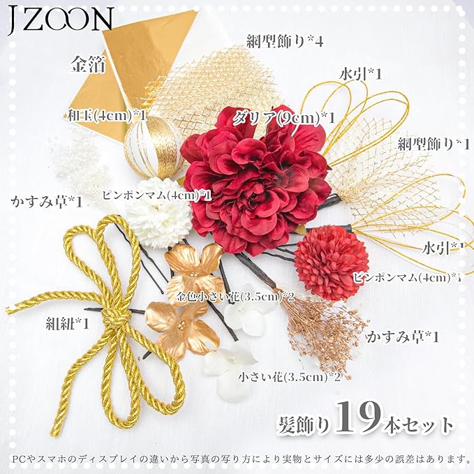 【鮮やかな和風】 ダリア、ピンポンマム、金色小さい花、かすみ草といった華やかなフラワーが大量にご用意、お花が大好きな方はぜひお見逃しなく!網型飾り、水引き、金箔、組紐といった和風に溢れたパーツが様々なお花と相まって、合計19点セットの髪飾りで可愛さと優雅さをMAXに。