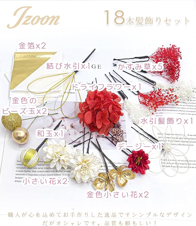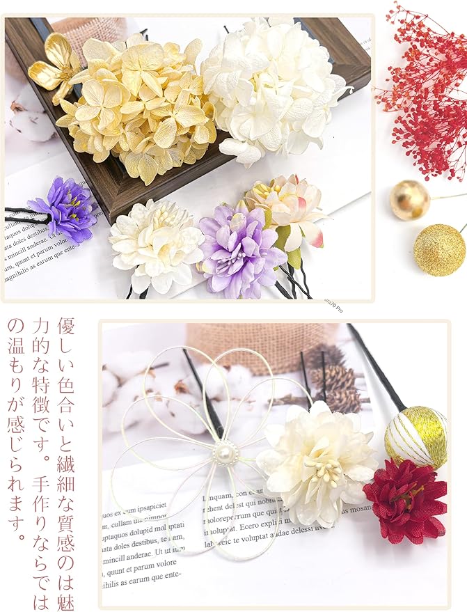 [JZOON] 成人式 髪飾り 金箔入り ドライフラワー ダリア 卒業式 袴 振袖 着物 浴衣 和装 和服 和玉 かすみ草 手作り 専用ケース付き Y6010
