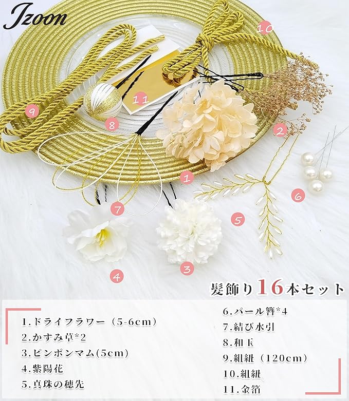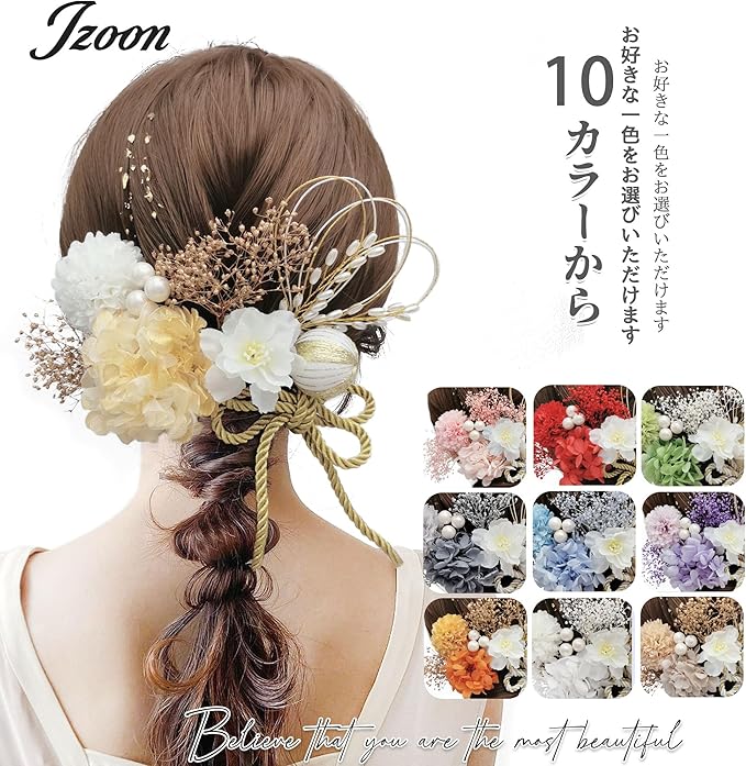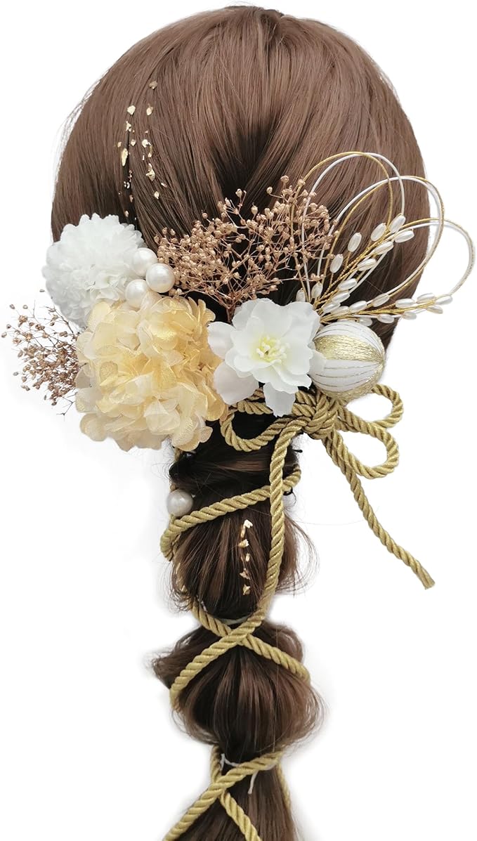 [JZOON] 髪飾り ヘアアクセサリー ドライフラワー 紫陽花 カスミソウ ピンポンマム 真珠の穂先 パール 水引 和玉 組紐 金箔 結婚式 入学式 卒業式 成人式 花火大会 着物 浴衣 袴 振袖 洋服 上品 華やか キラキラ 立体感 Y4401