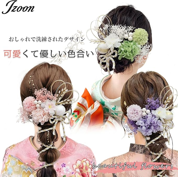 【様々なシーンで】、各パーツがUピンまたはIピン仕様になっております。ご使用時に量を加減でき、色んなアレンジをお楽しめます。成人式や花火大会などの和服シーンにも、結婚式やパーティーなどの洋服シーンにも大変お似合いです。