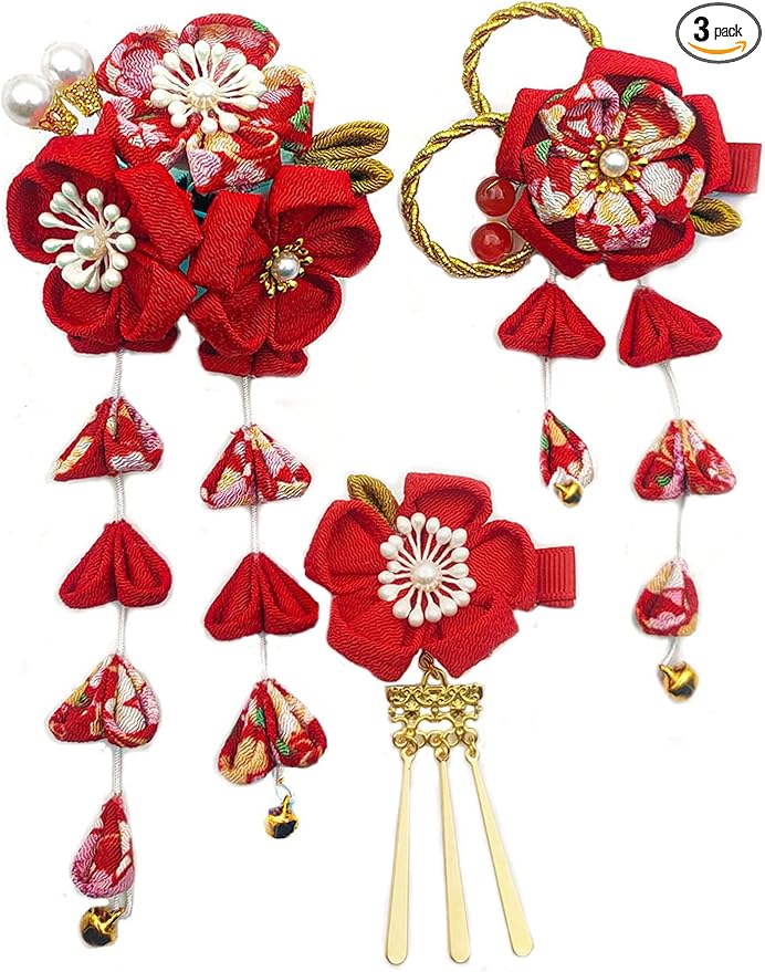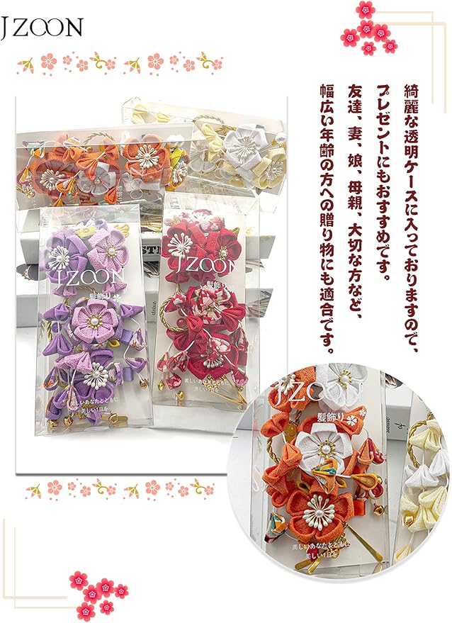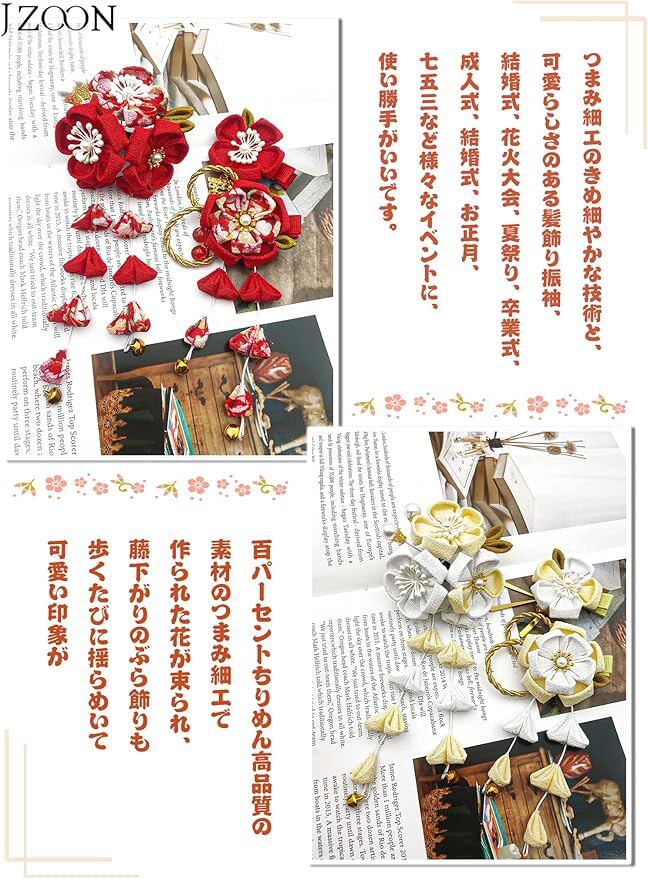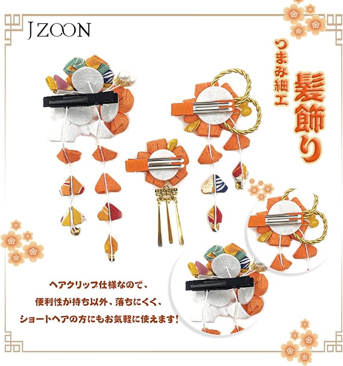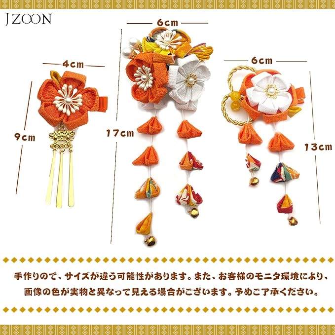 髪飾りは顔に一番近い部分の装飾品として、お召しになる着物の柄や小物の雰囲気にあわせてお選びいただけると着こなしがまとまります。ヘアスタイルを彩り、つまみ細工のJZOON髪飾り3点セットです。4色展開ので、お服の色に合わせ、ご自由に選択いただきようお願い申し上げます。