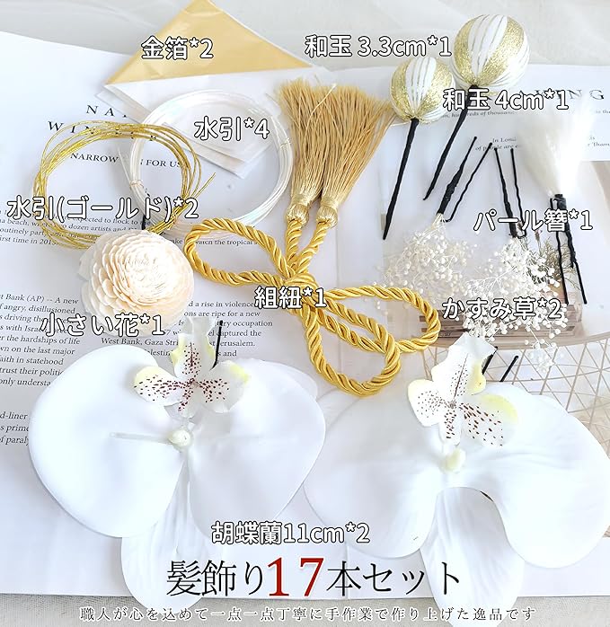 【商品のご説明】ご覧いただきありがとうございます。本品は白い胡蝶蘭がメインに和玉、網型飾り、水引きなど様々なゴールド系のパーツが組み合わさったオリジナル髪飾りです。パーツの数が異なるそれぞれ3タイプをご用意しており、どれもキレイで上品さが溢れます。